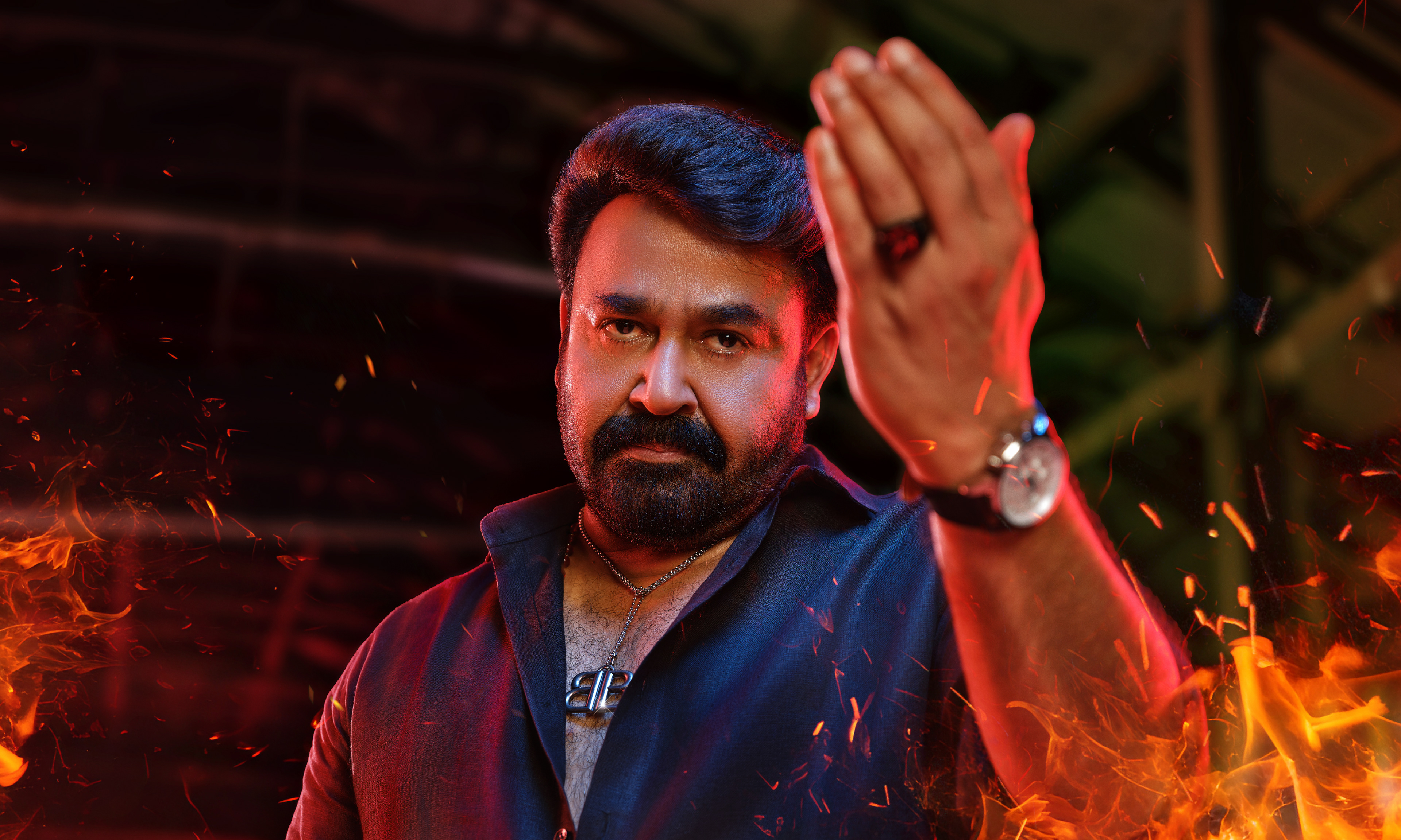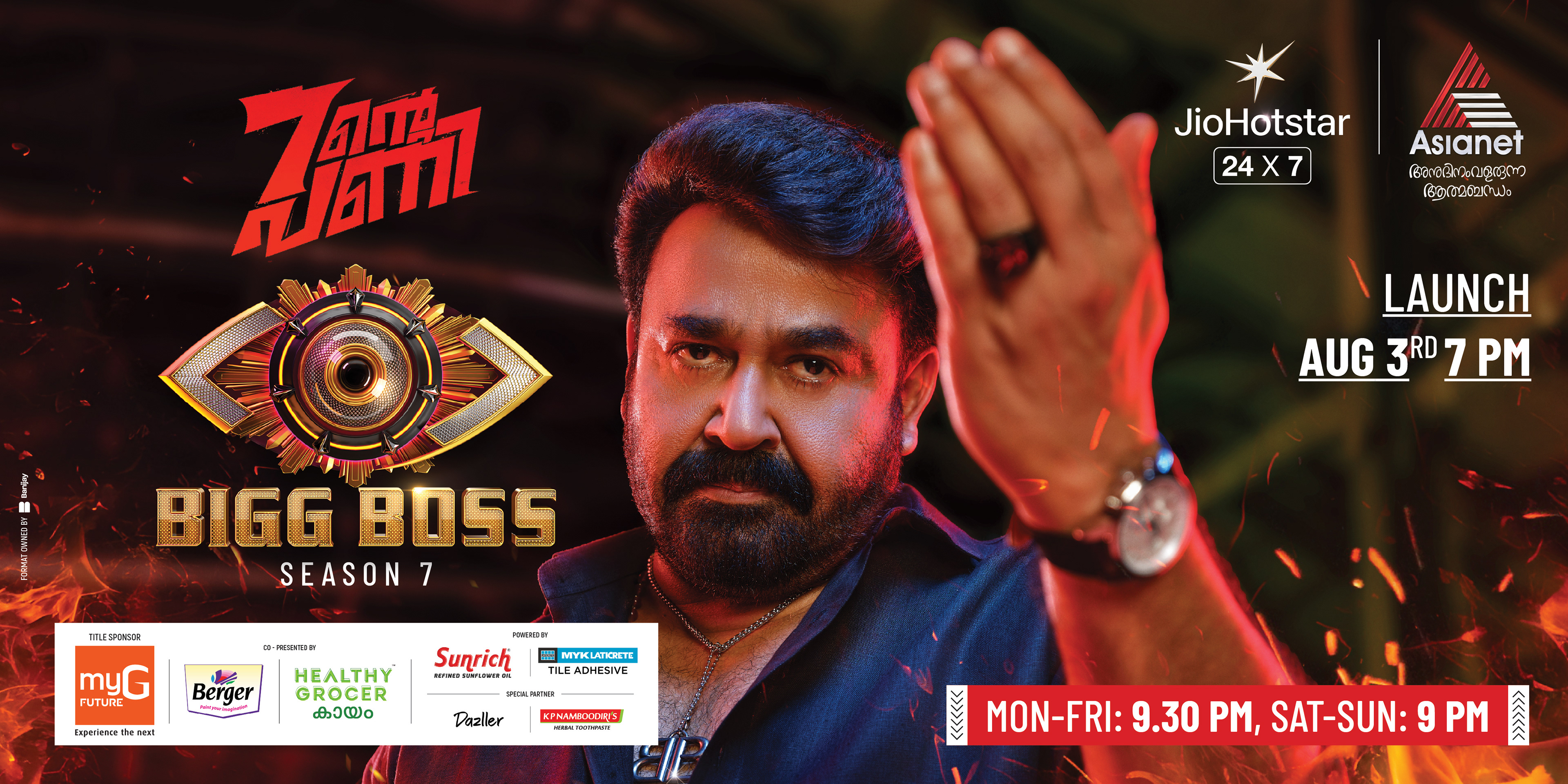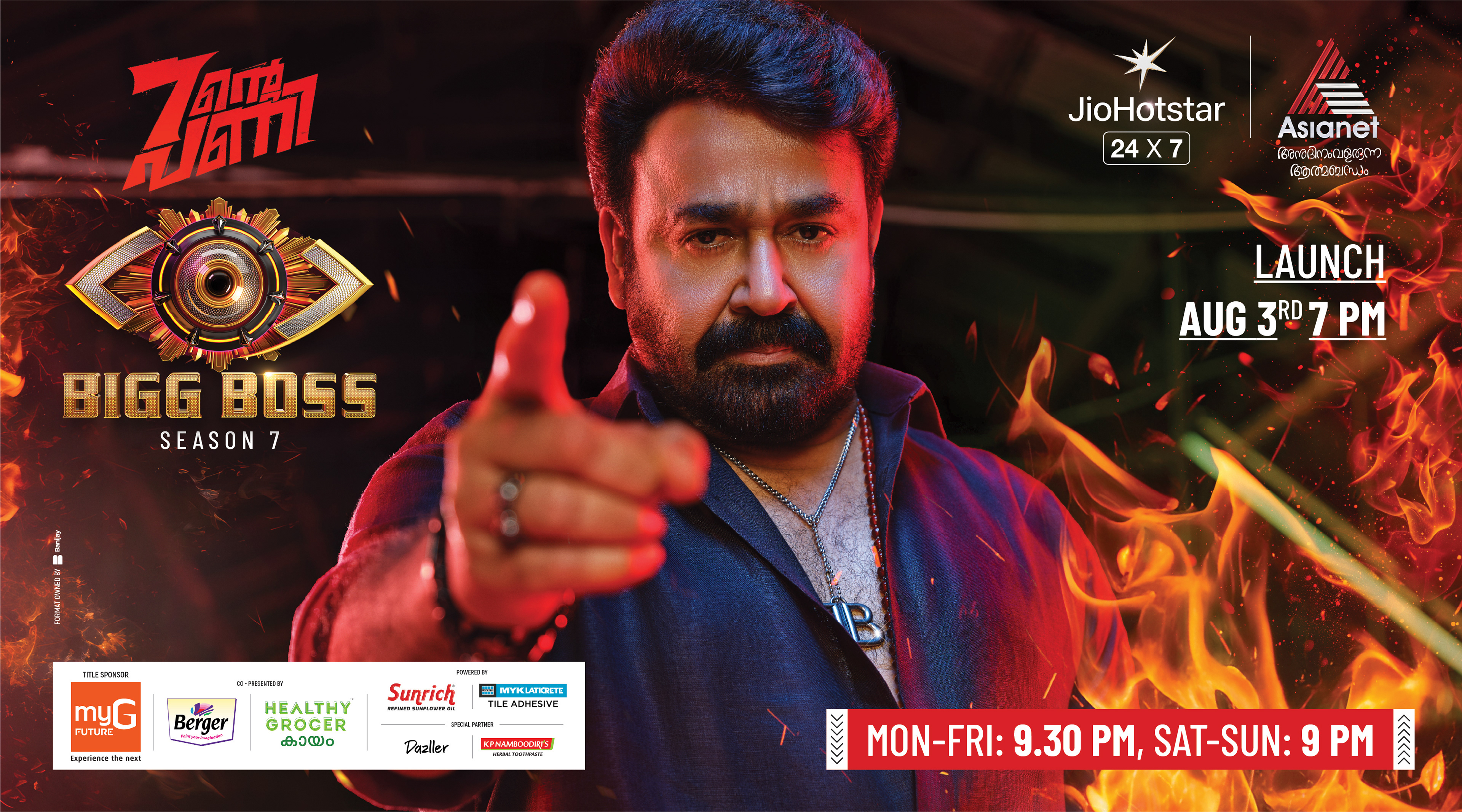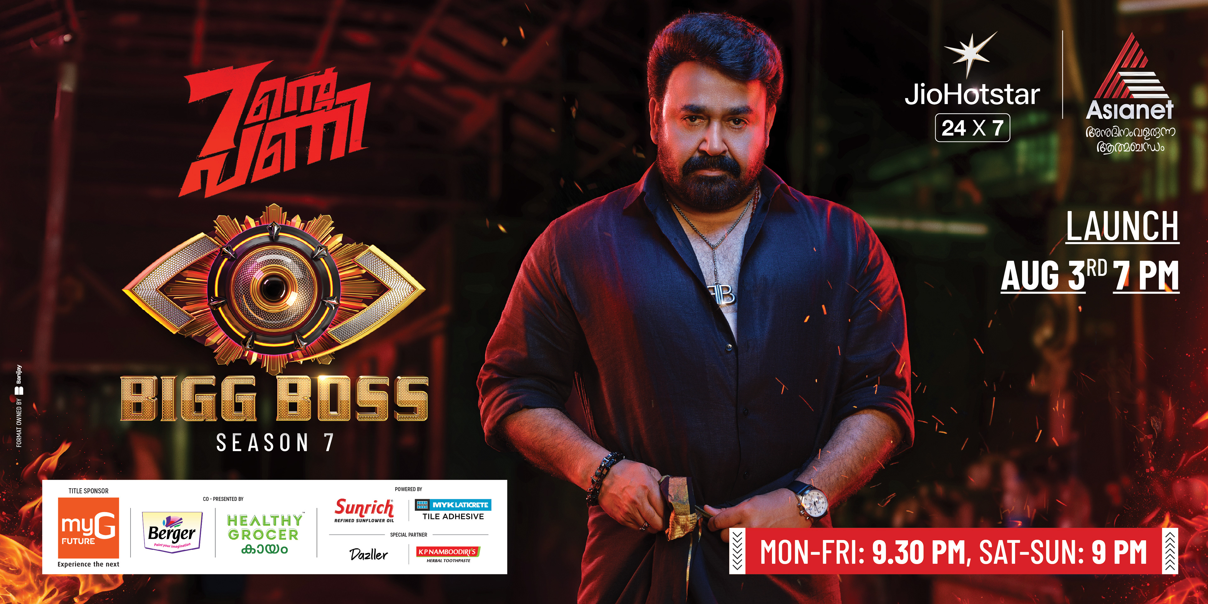 This campaign artwork for Bigg Boss Season 7 is designed to capture the raw intensity and commanding aura of the show—where every glance challenges, and every gesture sets the rules. At the heart of the visual stands Mohanlal (Lalettan)—unshakable, fearless, and absolute. His iconic stance and piercing gaze embody the spirit of Bigg Boss: control, confrontation, and truth laid bare. The dramatic lighting, fiery textures, and bold color palette amplify the tension, transforming the frame into a battlefield of emotions. This artwork was crafted to reflect the scale and prestige of Bigg Boss Malayalam Season 7, a cultural phenomenon that commands millions of viewers and defines prime-time entertainment in Kerala.